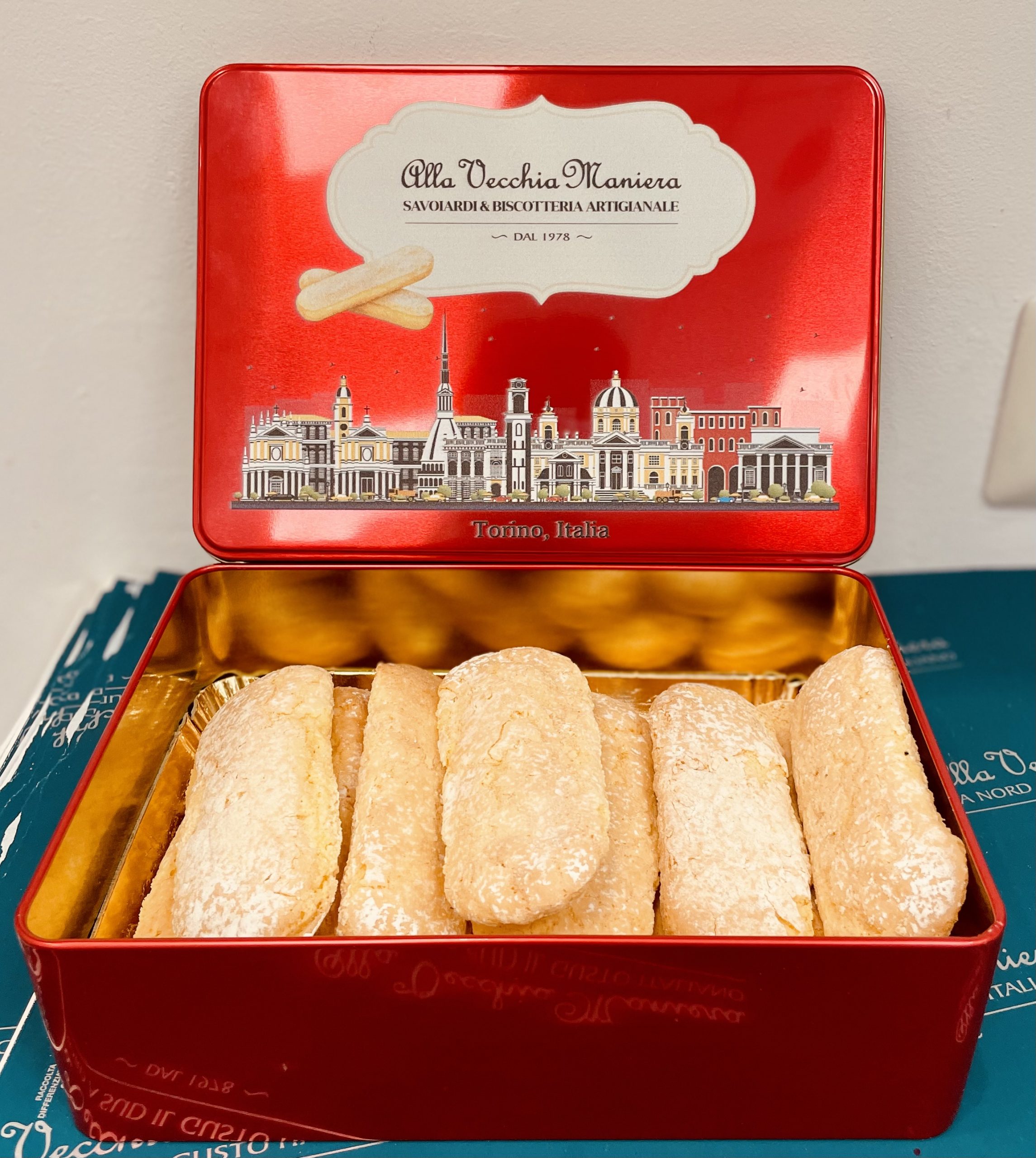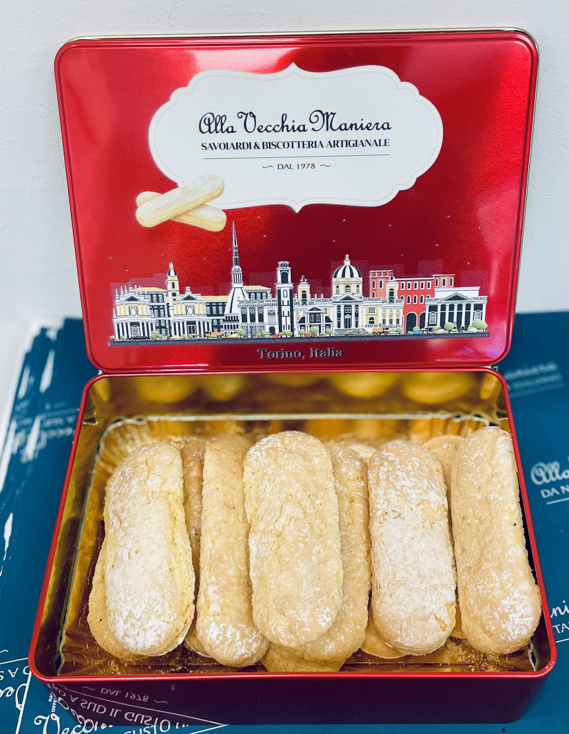 i nostri Savoiardi Reali morbidi e soffici, creati secondo la tradizione torinese, in esclusiva scatola di latta